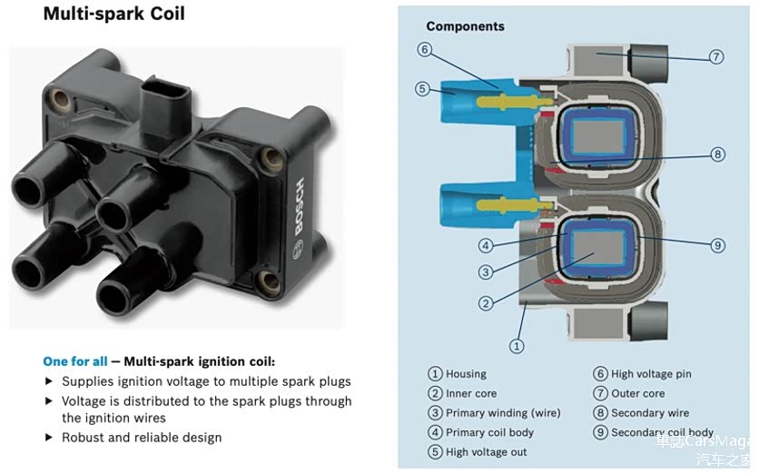 图:无论点火线圈如何进化,其基础原理是不变的,那便是通过电磁感应将弱电的电压升高,以满足火花塞的用电需求